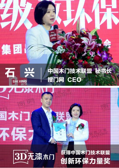 中国木门技术联盟秘书长/搜门网CEO石兴也在3D家居集团此次的发布会上做了重要发言, 认可3D家居集团在环保领域的倾力付出,同时还为3D无漆木门颁发了《创新环保力量》奖。
